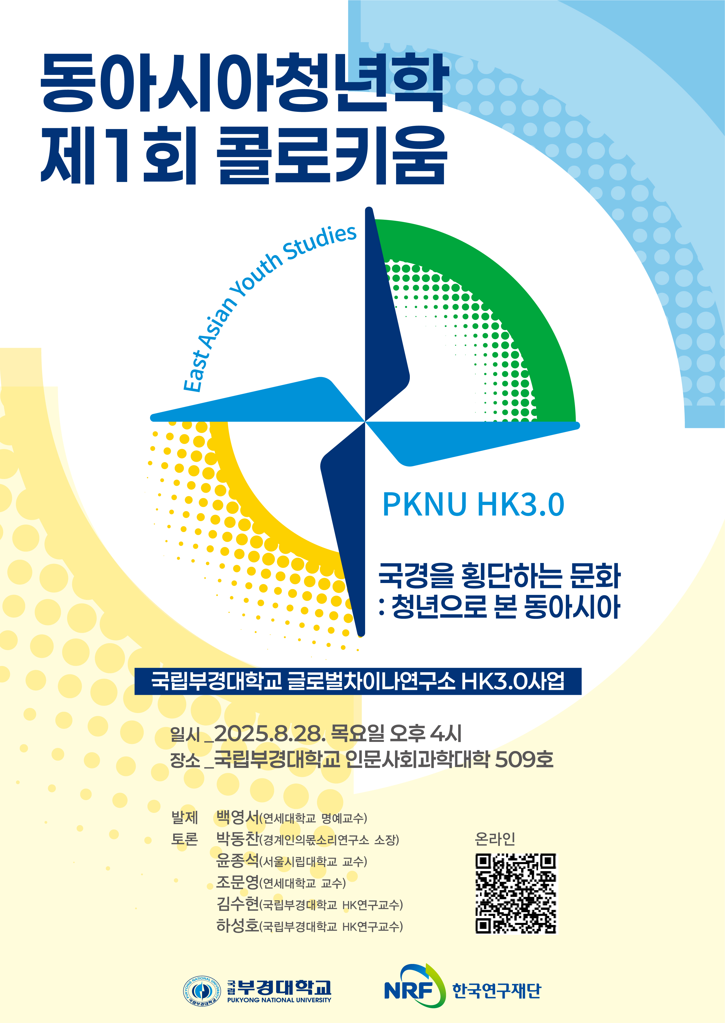 글로벌차이나연구소 인문한국3.0(HK3.0)사업단 제1회 동아시아청년학 콜로키움 1. 주제: 『국경을 횡단하는 문화: 청년으로 본 동아시아』 2. 발제: 백영서(연세대학교 명예교수) 3. 토론 - 조문영(연세대학교 문화인류학과 교수) - 윤종석(서울시립대학교 중국어문화학과 교수) - 박동찬(경계인의몫소리연구소 소장) - 김수현(국립부경대학교 HK연구교수) - 하성호(국립부경대학교 HK연구교수) 4. 일시: 2025. 8. 28.(목) 16:00~ 5. 장소: 인문사회경영관 509호 및 온라인(https://pknu.zoom.us/j/81683359118?pwd=jCa77TD5rs8m2a5y7gXdaubzwFkLt6.1) |