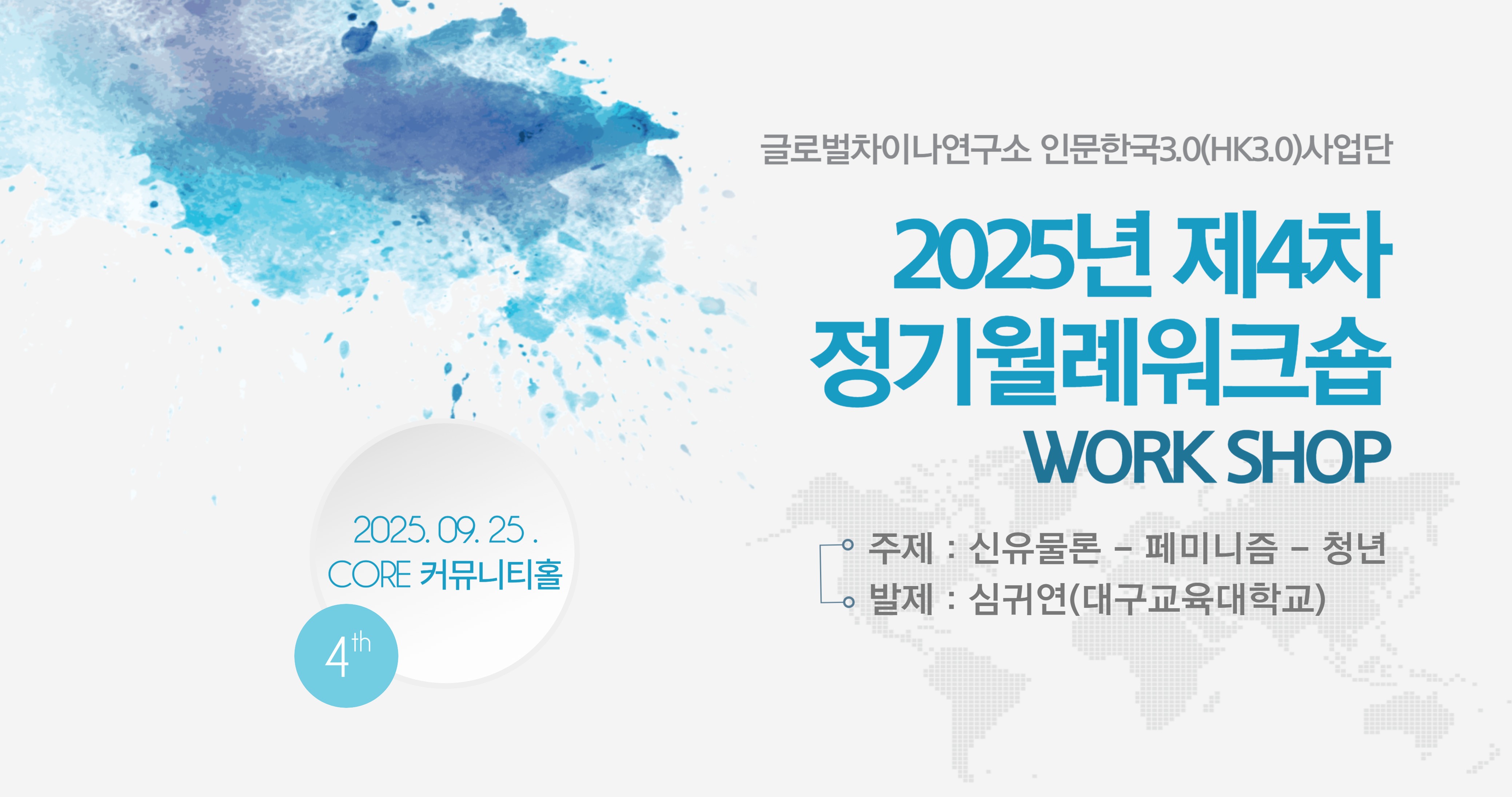 제4회 HK3.0 정기월례워크숍 주제 「신유물론 - 페미니즘 - 청년」 발제 심귀연(대구교육대학교 학술연구교수) 일시 2025년 9월 25일(목) 10:00 ~ 12:00 장소 인문사회경영관 509호 커뮤니티홀 문의 글로벌차이나연구소 인문한국3.0사업단(051-629-7498) |