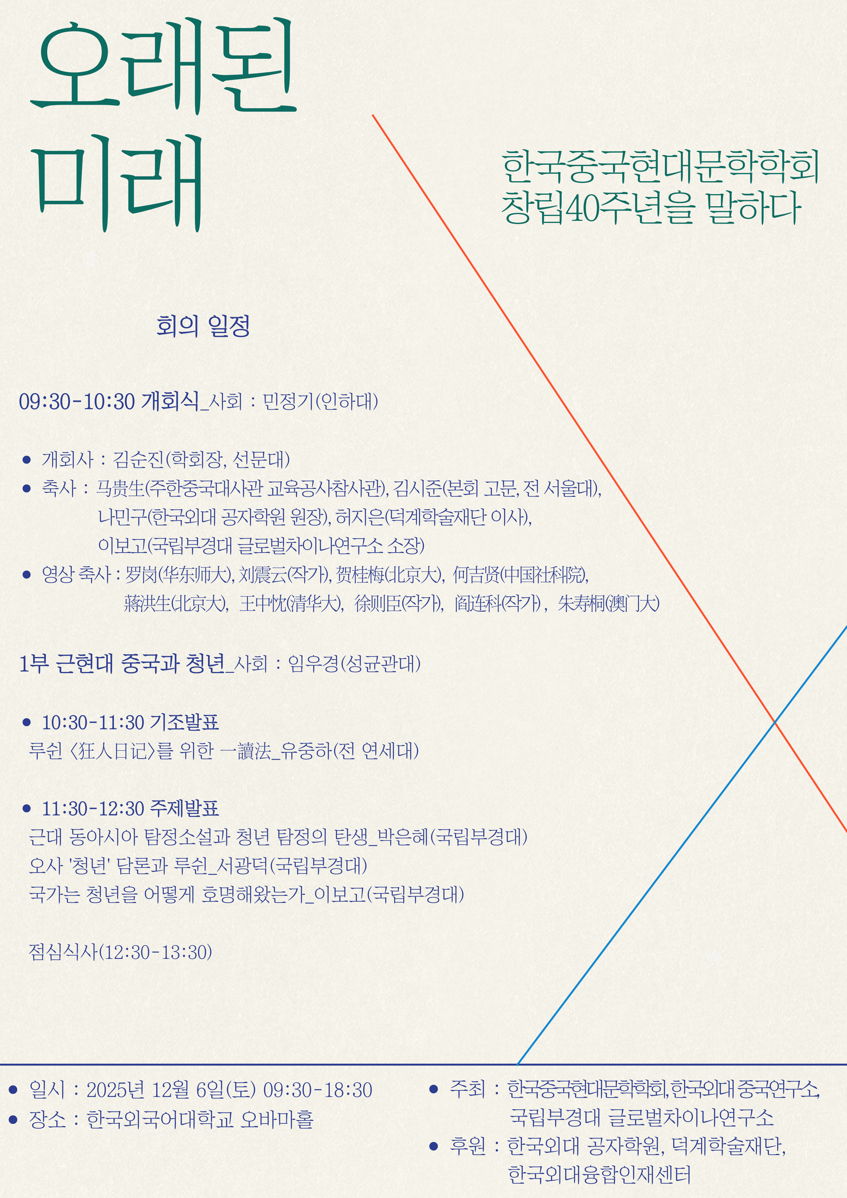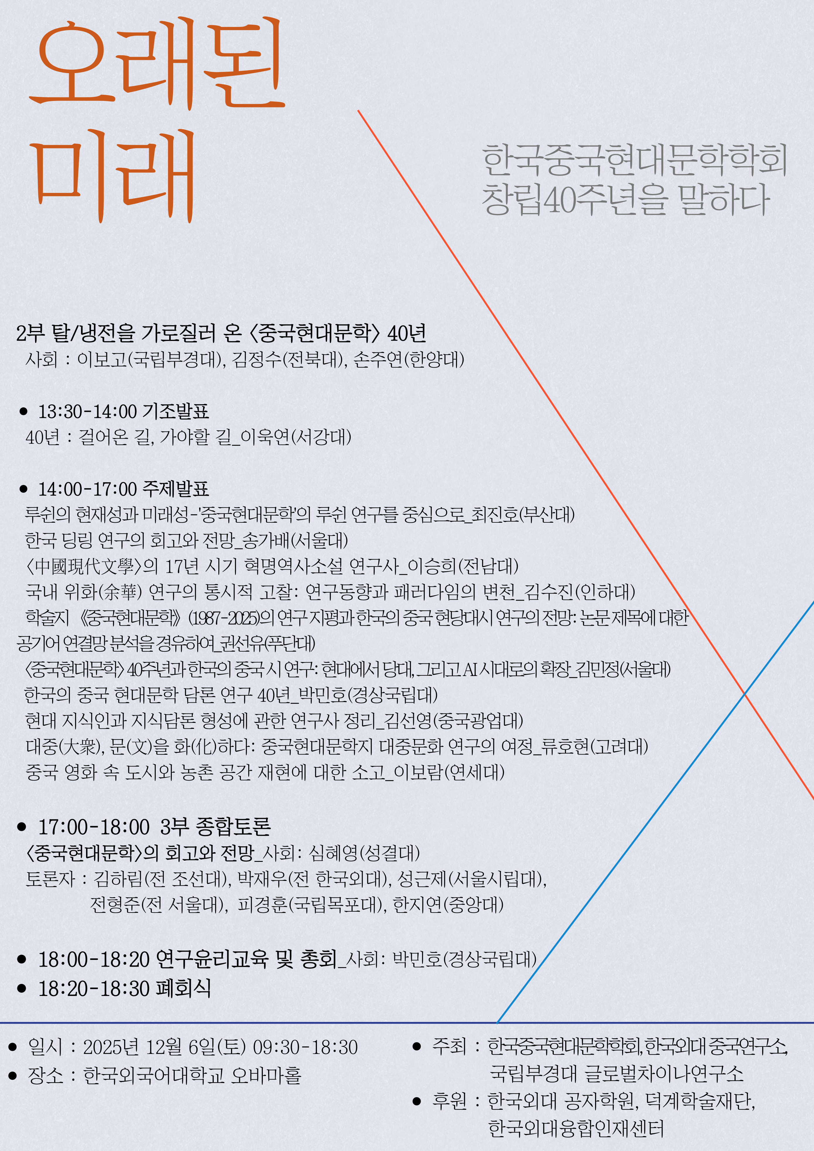 제2회 국내학술대회 - 한국중국현대문학학회 공동 주최 - 주 제 1부: 근현대 중국과 청년 / 2부: 탈/냉전을 가로질러 온 <중국현대문학> 40년 일 시 2025년 12월 6일(토) 09:30 ~ 18:30 장 소 한국외국어대학교 오바마홀 주요 발표