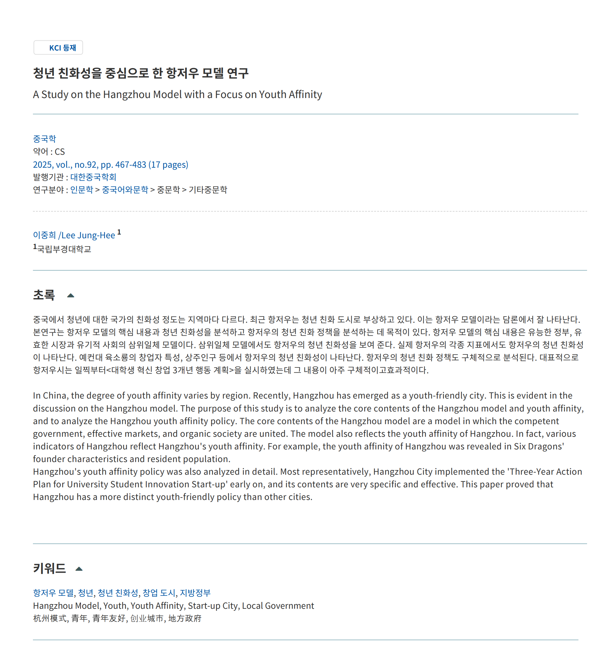 이중희. (2025). 청년 친화성을 중심으로 한 항저우 모델 연구. 중국학, 92, 467-483. Lee Jung-Hee. (2025). A Study on the Hangzhou Model with a Focus on Youth Affinity. Chinese Studies, 92, 467-483. DOI http://dx.doi.org/10.14378/KACS.2025.92.92.21