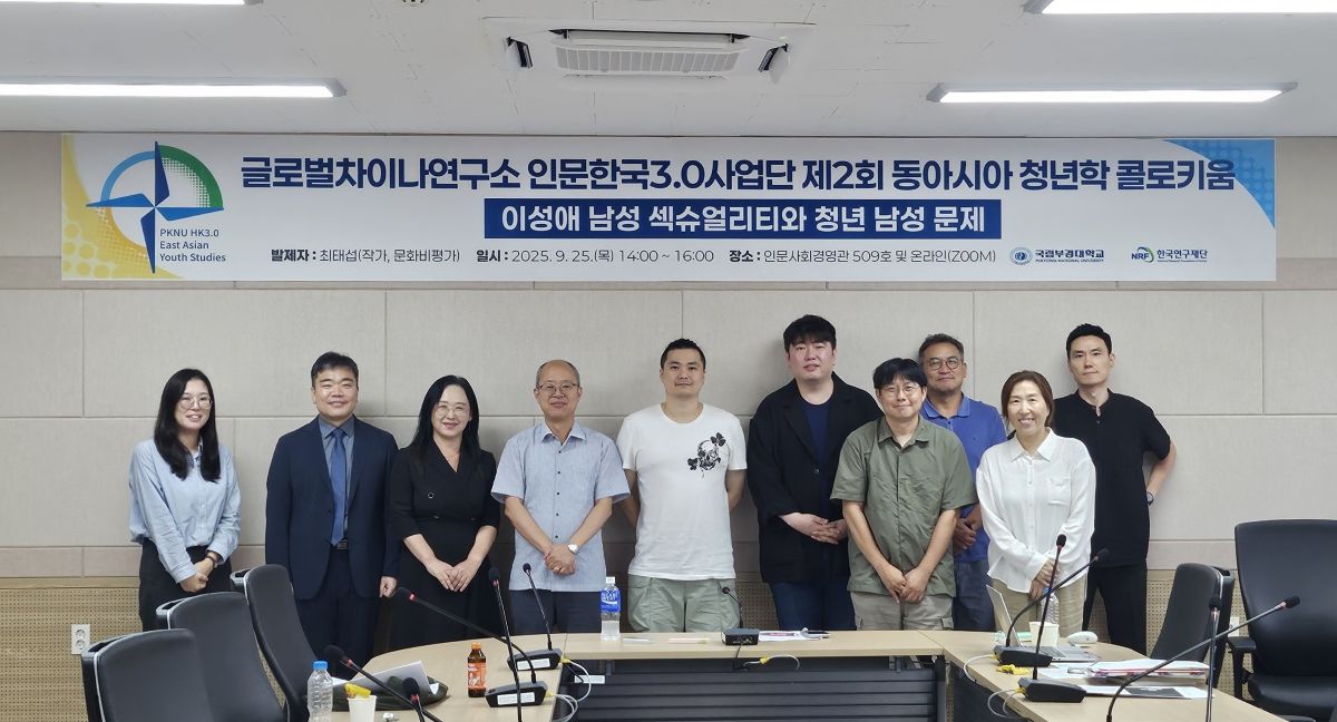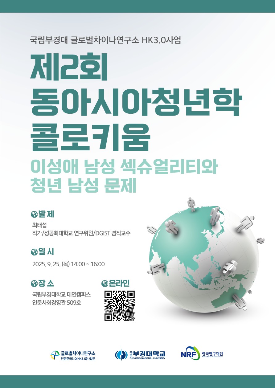 [글로벌차이나연구소 인문한국3.0사업단 제2회 동아시아청년학 콜로키움] 1. 주 제: 이성애 남성 섹슈얼리티와 청년 남성 문제 2. 발 제: 최태섭 작가(성공회대학교 연구위원/DGIST 겸직교수) 3. 일 시: 2025년 9월 25일(목) 16:00~18:10 4. 장 소: 국립부경대학교 인문사회경영관 509호 및 온라인(zoom) 5. 대 상: HK3.0 연구인력 및 관심있는 교내·외 연구자 등 6. 참석현황: 총65명(오프라인: 16명 / 온라인: 49명) 7. 주요결과 - 기존 연구에서 상대적으로 소외되었던 이성애 남성 섹슈얼리티의 구조와 특권을 성찰함으로써, 청년 남성 문제를 보다 입체적으로 이해하는 토대를 마련하고, 이를 통해 젠더 연구의 사각지대를 해소하고 새로운 학문적 논의 지평을 확장 - 청년 남성의 성적 주체성과 사회적 위치를 분석하여 젠더 간 불평등과 갈등이 형성 되는 구조적 맥락을 밝혀 청년 세대의 젠더 관계를 더 깊이 이해하고 사회적 연대 가능성을 모색 - 연구 성과를 학문 공동체와 공유함으로써, 후속 연구의 자극제가 될 뿐만 아니라 관련 연구자들의 협업과 토론 촉진 - 다양한 학문적 관점과 현장 경험을 연결하여 사회적 담론 확산의 계기 마련 |