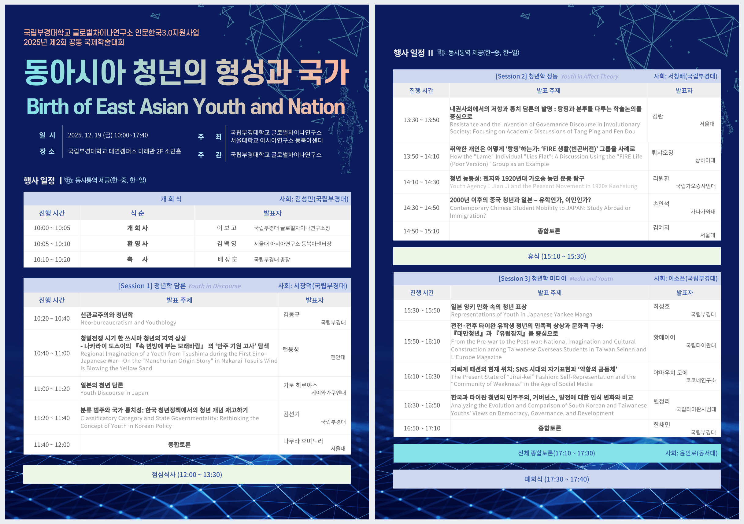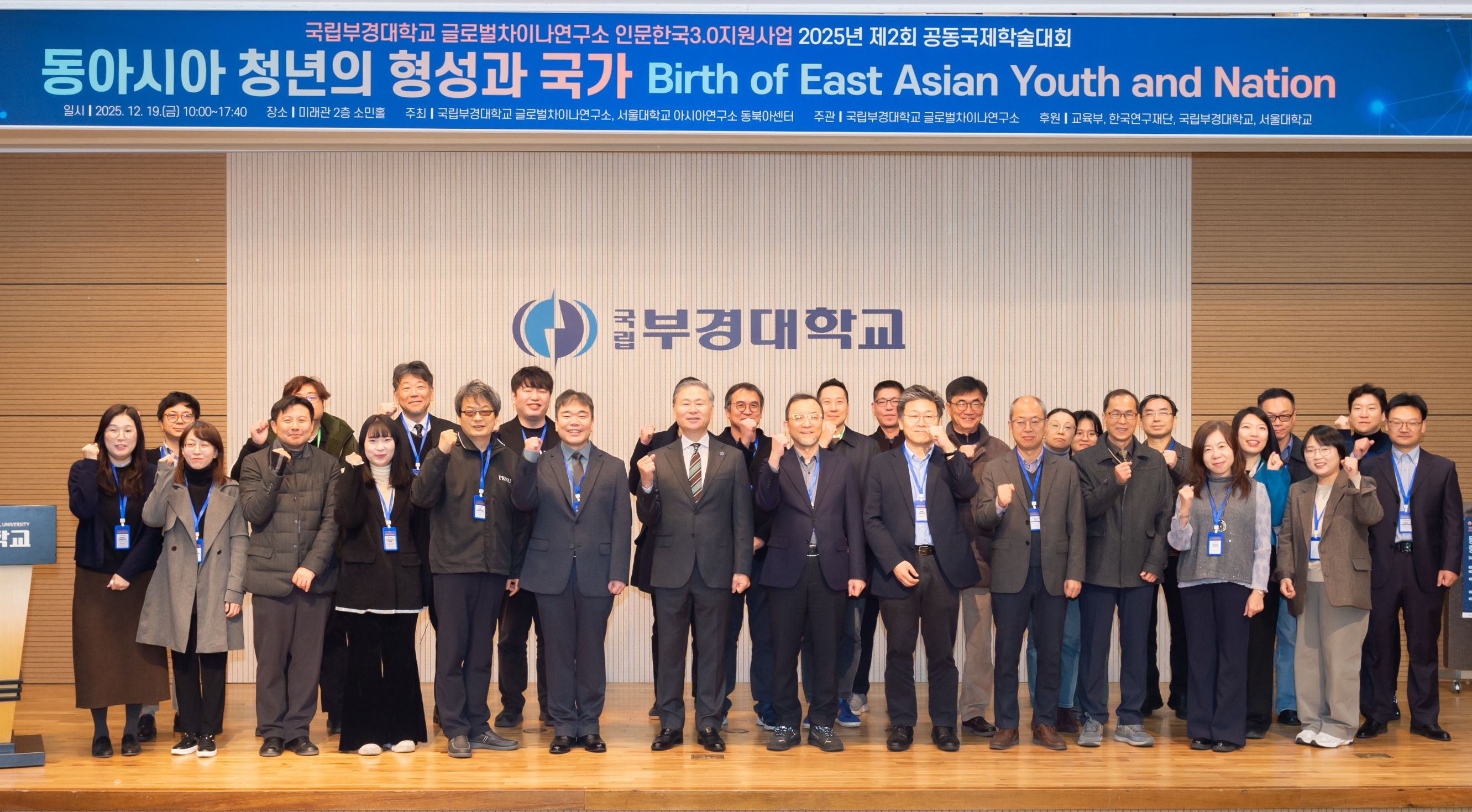 [글로벌차이나연구소 인문한국3.0사업단 제2회 공동 국제학술대회(서울대 아시아연구소 동북아센터)] 1. 주 제: 동아시아 청년의 형성과 국가 Birth of East Asian Youth and Nation 2. 일 시: 2025년 12월 19일(금) 10:00~17:40 3. 장 소: 국립부경대학교 미래관 소민홀 및 온라인 4. 주 최: 국립부경대학교 글로벌차이나연구소, 서울대학교 아시아연구소 동북아시아센터 5. 주 관: 국립부경대학교 글로벌차이나연구소 6. 참석현황: 101명(온라인 44명 포함) 7. 개최 성과 - 동아시아 청년의 형성과 국가 간 관계에 대한 비교·종합적 논의를 통해 청년학 연구의 이론적·방법론적 확장에 기여 - 청년학 담론·정동·미디어를 아우르는 다층적 연구 성과를 공유함으로써 동아시아 청년학의 학문적 기반을 강화 - 국내외 저명 연구기관 간 공동주최 및 참여를 통해 동아시아 청년 연구 분야의 지속 가능한 학술 협력 체계를 구축 - 국제 학술 네트워크 형성을 통해 동아시아 청년학 연구의 장기적 협력 기반을 조성 - 대면·비대면 병행 운영을 통한 학술 성과 확산 및 연구 대중성과 접근성 제고 -「동아시아 청년학(East Asian Youth Studies)」 연구 아젠다의 실천적 출발점 마련 |