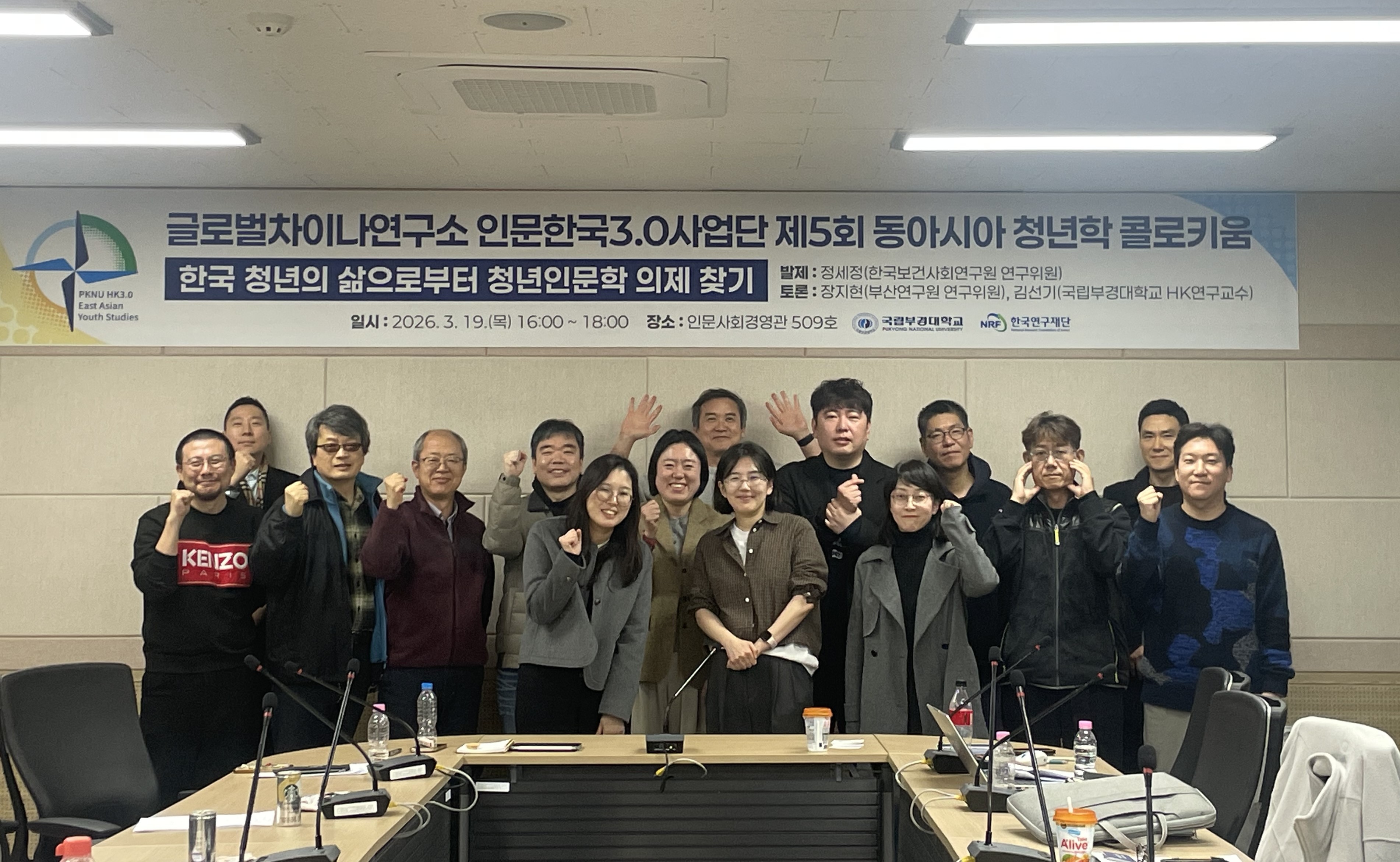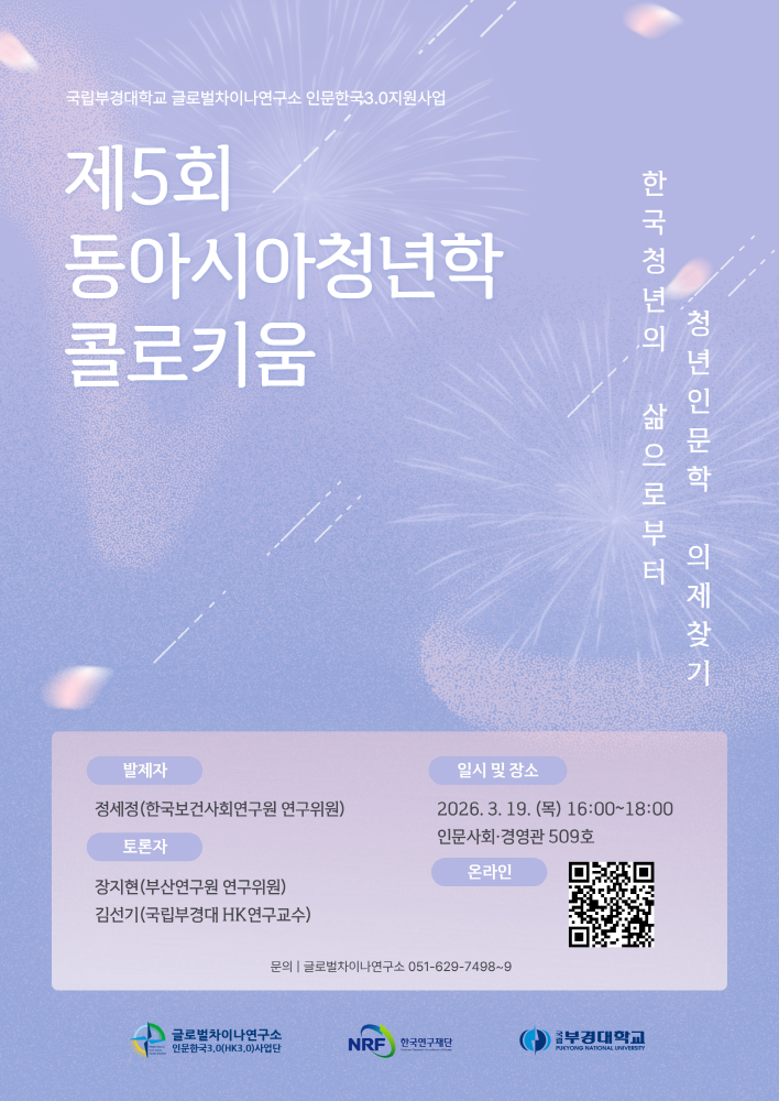[글로벌차이나연구소 인문한국3.0사업단 제5회 동아시아청년학 콜로키움] 1. 주 제: 한국 청년의 삶으로부터 청년인문학 의제 찾기 2. 발 제: 정세정(한국보건사회연구원 연구위원) 3. 토 론: 장지현(부산연구원 연구위원), 김선기(국립부경대 HK연구교수) 4. 일 시: 2026년 3월 19일(목) 16:00~18:30 5. 장 소: 국립부경대학교 인문사회·경영관 509호 및 온라인(zoom) 6. 대 상: HK3.0 연구인력 및 관심있는 교내·외 연구자 등 7. 참석현황: 총24명(오프라인: 22명 / 온라인: 2명) 8. 주요결과 - 청년 삶 실태조사와 통계, 당사자 경험을 결합한 발표를 통해 청년 문제를 단일 이슈가 아닌 주거·노동·정신건강·관계 등 다차원적 구조 문제로 재인식하는 계기를 마련함. - 학계 연구자 간 논의를 통해 청년의 삶을 기반으로 한 청년인문학 연구 의제를 구체화하고, 향후 연구 및 학술 교류의 방향성을 도출함. - 청년 정책과 현실 간 괴리를 점검하고, 실효성 있는 정책 설계 및 공론 형성을 위 한 학술적·사회적 기반을 강화하는 데 기여함. |