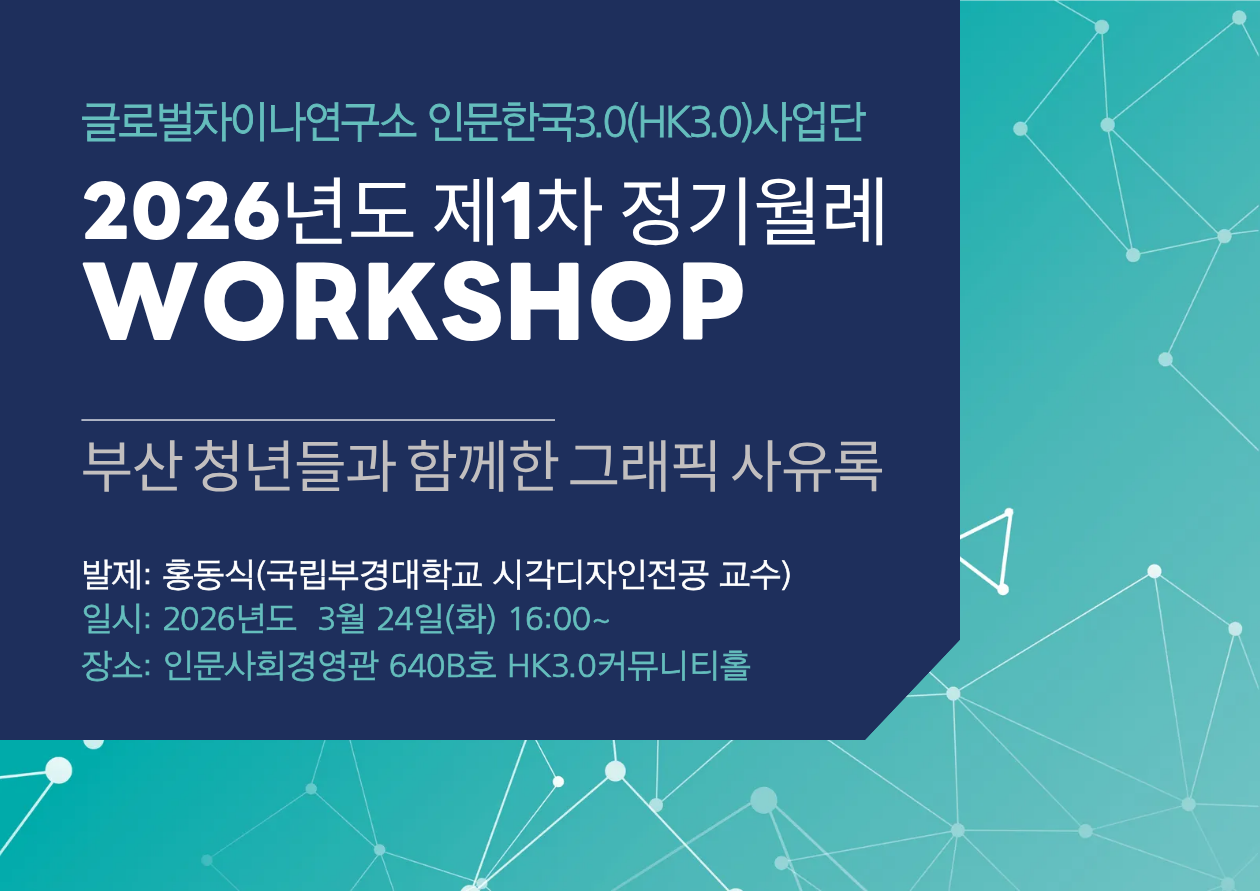 [글로벌차이나연구소 인문한국3.0사업단 2026년 제1차 정기월례워크숍] 1. 주 제: 부산 청년들과 함께한 그래픽 사유록 2. 발 제: 홍동식 (국립부경대학교 시각디자인전공 교수) 3. 일 시: 2026년 3월 24일(화) 16:00~18:00 4. 장 소: 국립부경대학교 인문사회경영관 640호 HK3.0커뮤니티홀 5. 참석 인원: 11명 6. 주요 결과 - 그래픽 사유록이라는 시각적 매체를 활용함으로써 연구 내용을 보다 직관적이고 접근성 높은 형태로 재구성할 수 있는 가능성 확인(연구성과의 대중화 및 사회적 확산에 기여할 수 있는 방안으로 평가) - 지역 청년과 연구자 간의 지속적인 협력 관계 형성의 출발점으로서 의미를 가지며, 향후 공동 기획 및 콘텐츠 제작으로 이어질 수 있는 협업 네트워크 구축에 기여