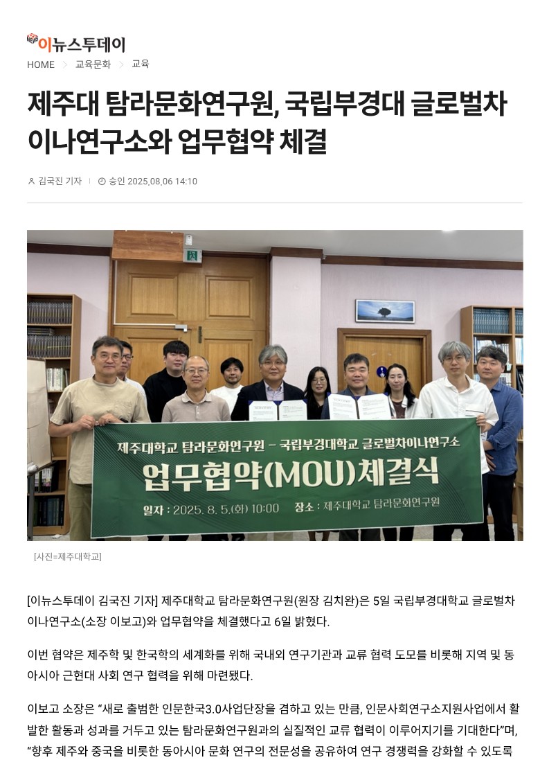 뉴스제주 탐라문화연구원, 부경대 글로벌차이나연구소와 업무협약 < 일반 < 교육 < 기사본문 - 뉴스제주