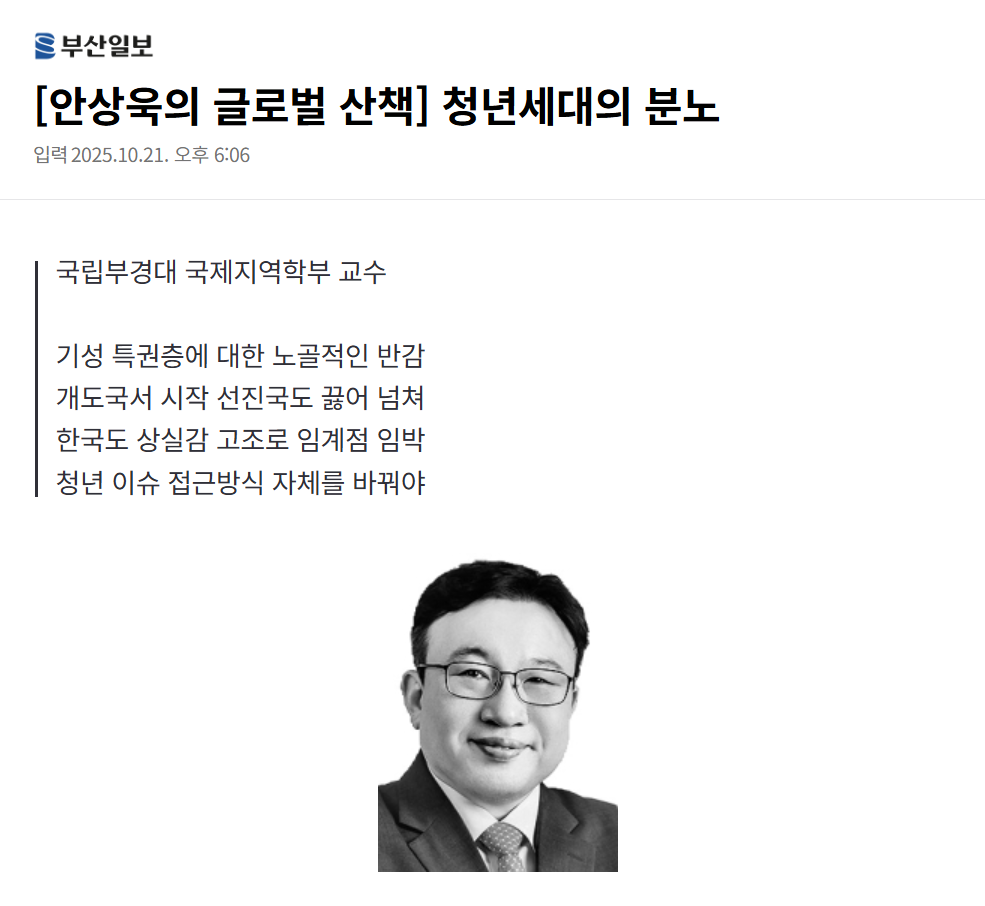 [언론보도] 안상욱의 글로벌 산책_청년세대의 분노(2025. 10. 21.)