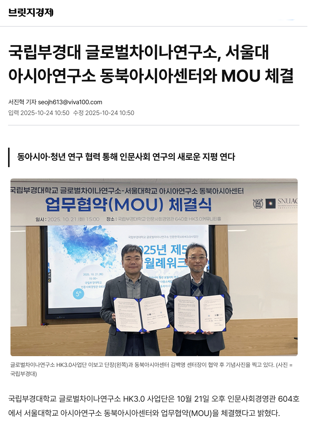 | [언론보도] 국립부경대 글로벌차이나연구소, 서울대 아시아연구소 동북아시아센터와 MOU 체결(2025. 10. 24.) | |||