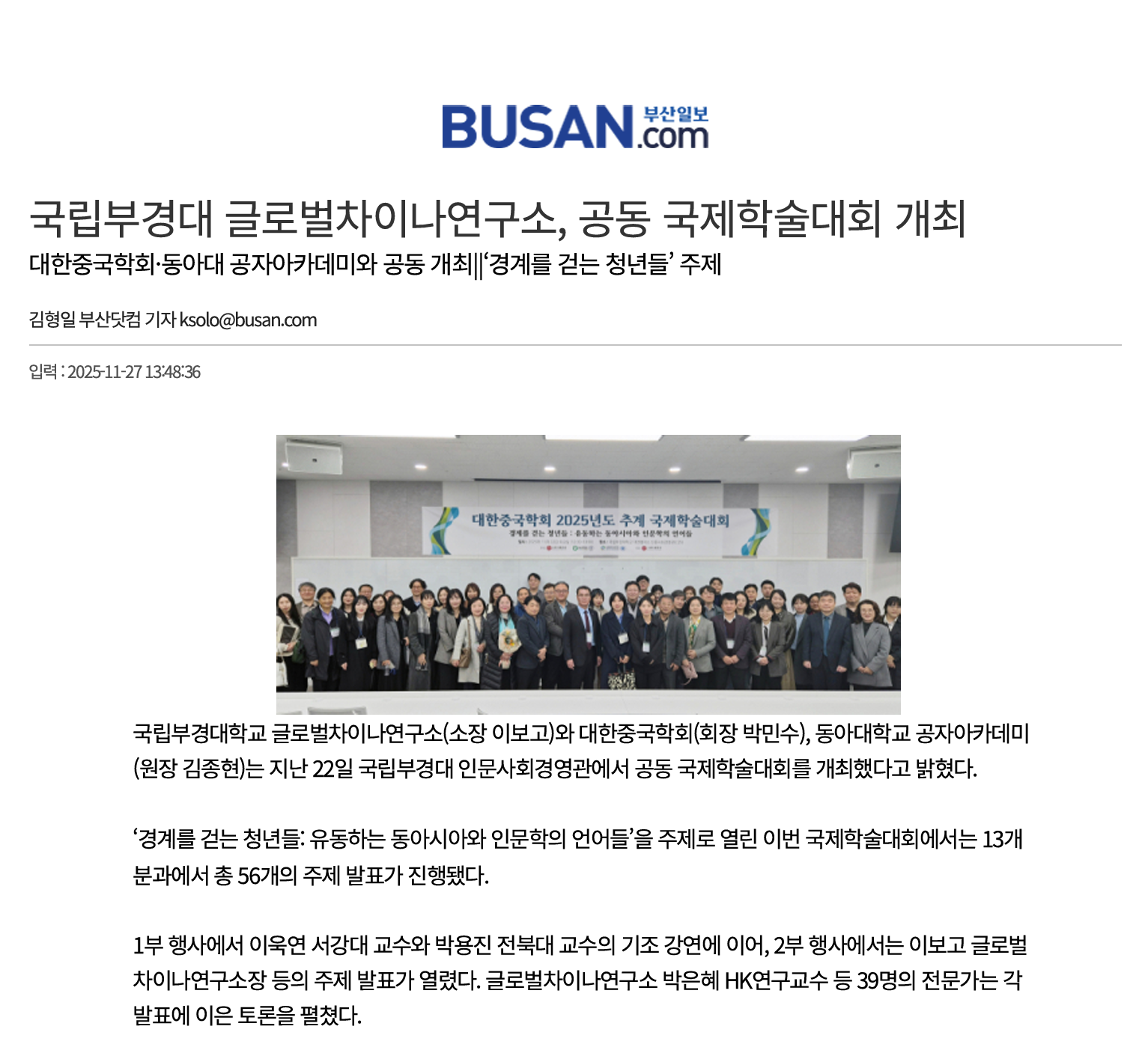 | [언론보도] 국립부경대 글로벌차이나연구소, 공동 국제학술대회 개최(2025. 11. 27.) | |||