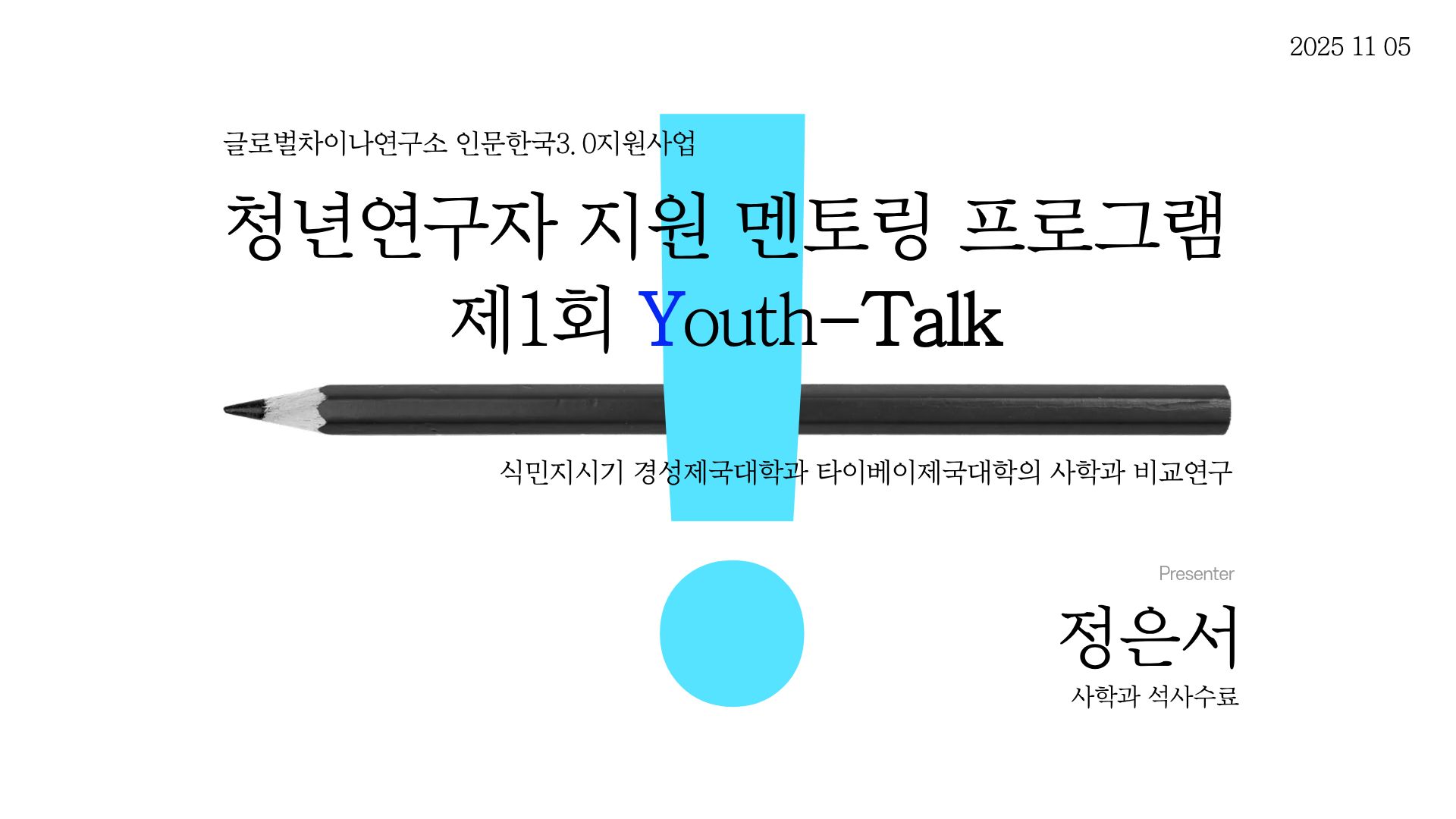 [글로벌차이나연구소 인문한국3.0사업단 제1회 청년 연구자 지원 멘토링(Youth-Talk)] * 대학원생의 연구 내용 발표 능력을 제고하고 멘토의 전문적 피드백을 통해 연구 설계 및 논문 구성의 완성도를 향상하기 위한 멘토링 1. 주 제: 식민지시기 경성제국대학과 타이베이제국대학의 사학과 비교연구 2. 대상자: 정은서(국립부경대학교 사학과 석사수료연구생) 3. 일 시: 2025년 11월 5일(수) 16:00~18:00 4. 장 소: 국립부경대학교 인문사회경영관 640B호 5. 내 용: 연구 진행 상황 발표 후 전문 피드백(발표 내용 및 용어 관련) 제공
